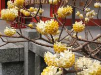 二階堂へ向かって小道を歩いていくと、荏柄天神の鳥居が見えてきます。この鳥居をくぐり、見上げるような石段を登ると、やはり紅梅・白梅が咲きほこっています。天神様ということで、観梅の人もちらほら。境内奥の筆塚からの眺めも、本堂と紅梅・白梅の構図がなかなかのものです。また、本堂の右手に鮮やかな黄色の花が満開になっています。これが三椏(みつまた)だと教えてもらいました。 先へ進むと鎌倉宮、ここから瑞泉寺を目指して歩きます。瑞泉寺は梅の名所として知られているためか、観梅の人で賑わっています。本当は静かに散策をしたいところですが仕方のないことでしょう。 帰り道は鎌倉宮の手前から曲がって、金沢街道への小道を進みます。小学校の先が金沢街道、すぐに杉本寺です。苔むした狭い急な石段の両側には、「十一面観音」と書かれた白い幟がびっしりと立ち並んでいる様が印象的です。 浄妙寺は閑静で落ち着いたたたずまいが魅力で、ときどきは来てみたくなるお寺です