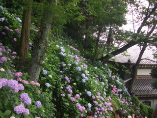 極楽寺切通しを進み、右手の坂の上に成就院があります。ここは紫陽花の美しいお寺として有名で、参道の両側に咲く120株の紫陽花を見にきた人がぎっしり。紫陽花の花越しに見える由比ヶ浜が眼下に広がっている景色はとてもすばらしいものです。 坂を下って力餅屋の角を曲がると、御霊神社です。ここでも神社の裏側をぐるっと回ってみると、紫陽花がよく咲いていました。 ちょっと遅めの昼食をすませて、次は長谷寺です。入り口から入ったところの庭には、睡蓮、花菖蒲、紫陽花、岩煙草(いわたばこ)、京鹿子(きょうかのこ)など梅雨の季節も花がいっぱいです。また、経蔵の裏の細い山道を登って行くと、裏山に広がる斜面に紫陽花が色とりどりに咲いています。紫陽花の中を歩いていくと、なんともいえずうれしくなりました。石段を上って、長谷観音として親しまれている観音堂へ。高さ約10mの本尊の十一面観音像にお参りしてから、となりにある宝物館へ。室町時代の作といわれる大黒天を拝んできました。 |